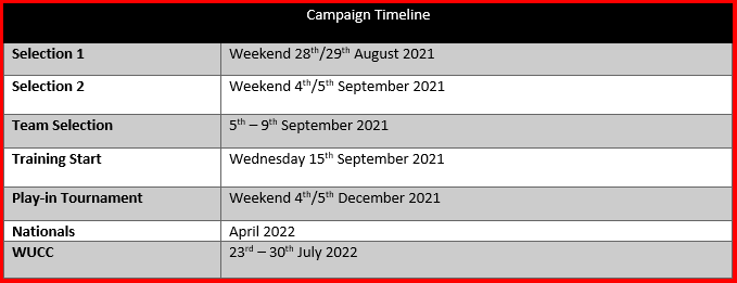 The campaign will comprise of team selection events, 2-3 weekly trainings, a qualification and seeding tournament (in AUS), and finally the WUCC tournament itself (in USA) as well as expected personal strength and conditioning work outside of the existing training commitments.